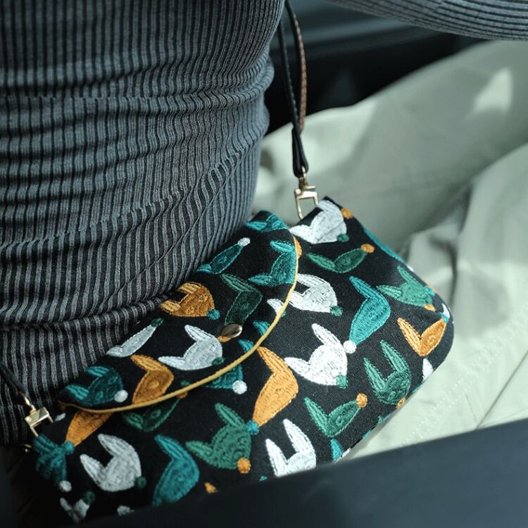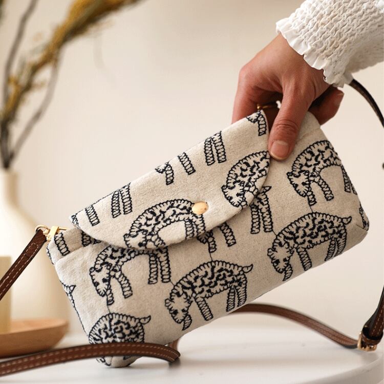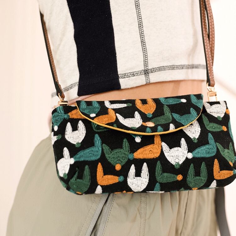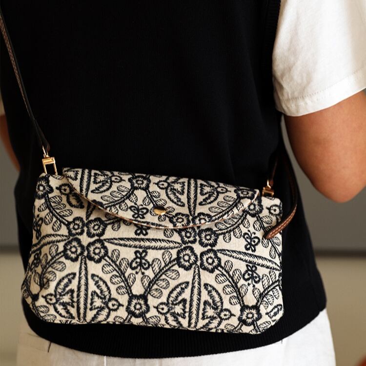 個性的なデザインの刺繍が目を惹く、キャンバス地のショルダーバッグ。