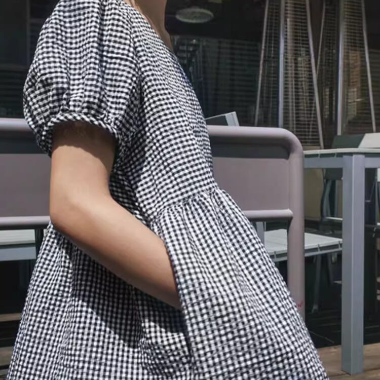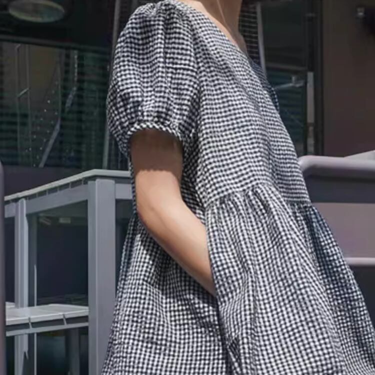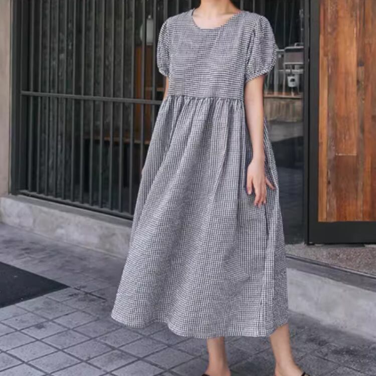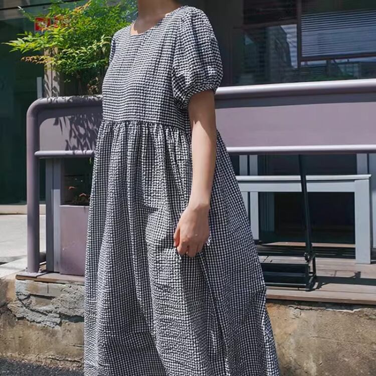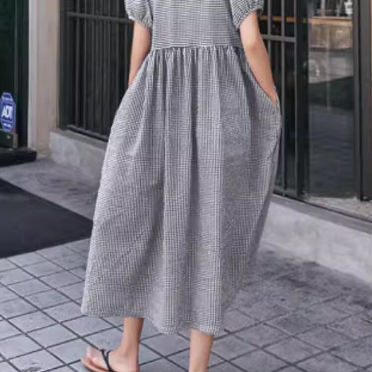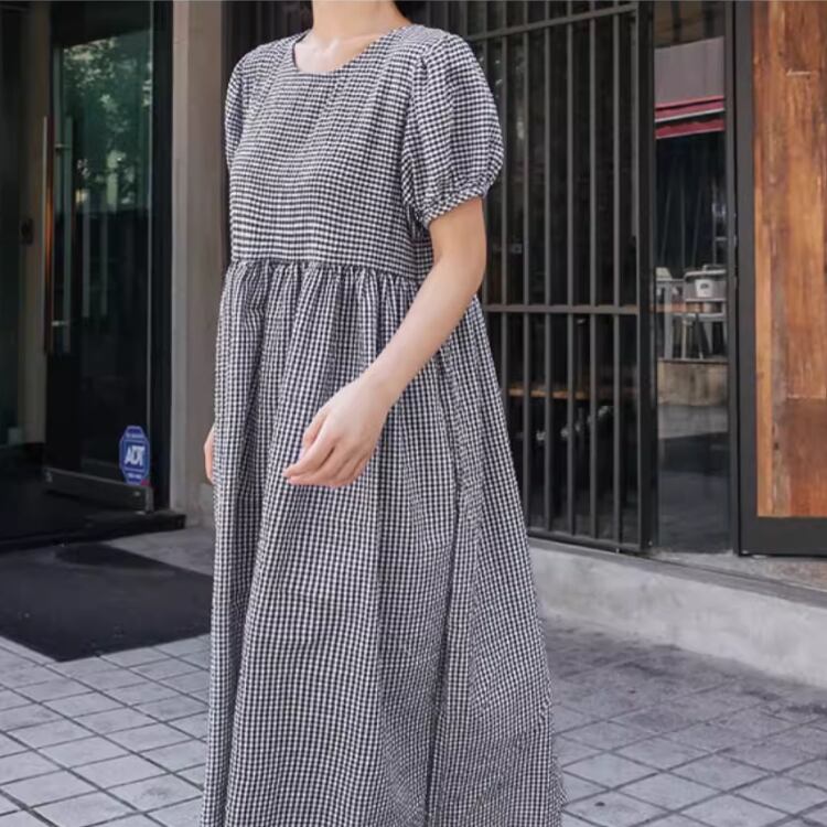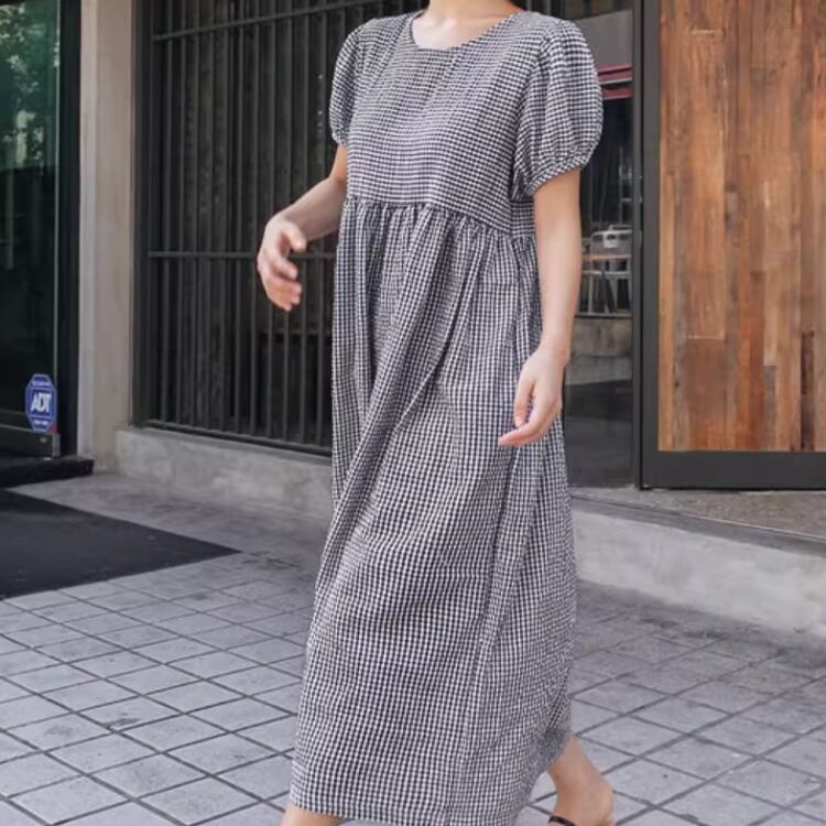 落ち着いたギンガムチェック柄が魅力的なAラインマキシワンピース。