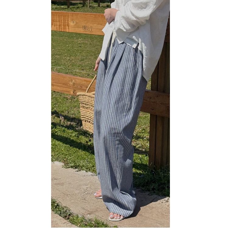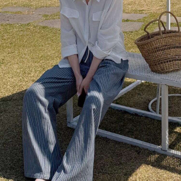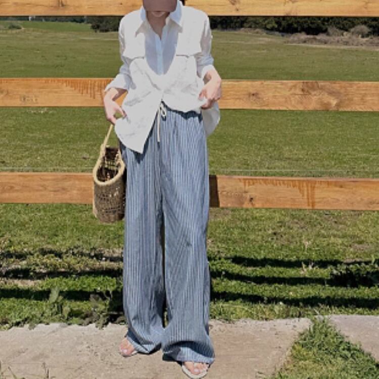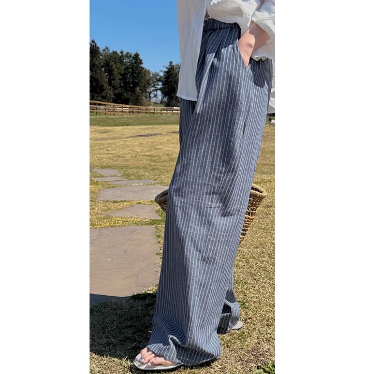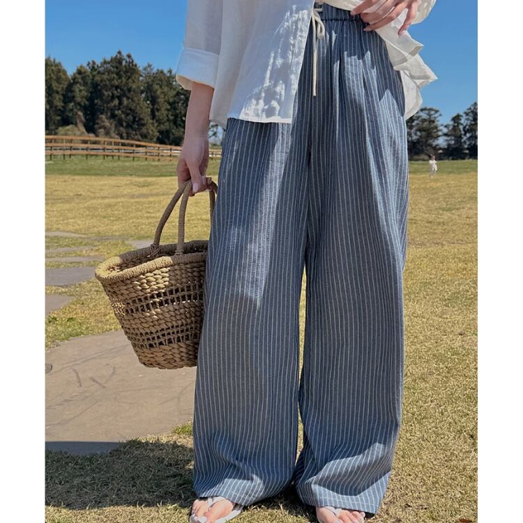 リラックス感と上品さを両立した、ストライプ柄のワイドレッグパンツ。