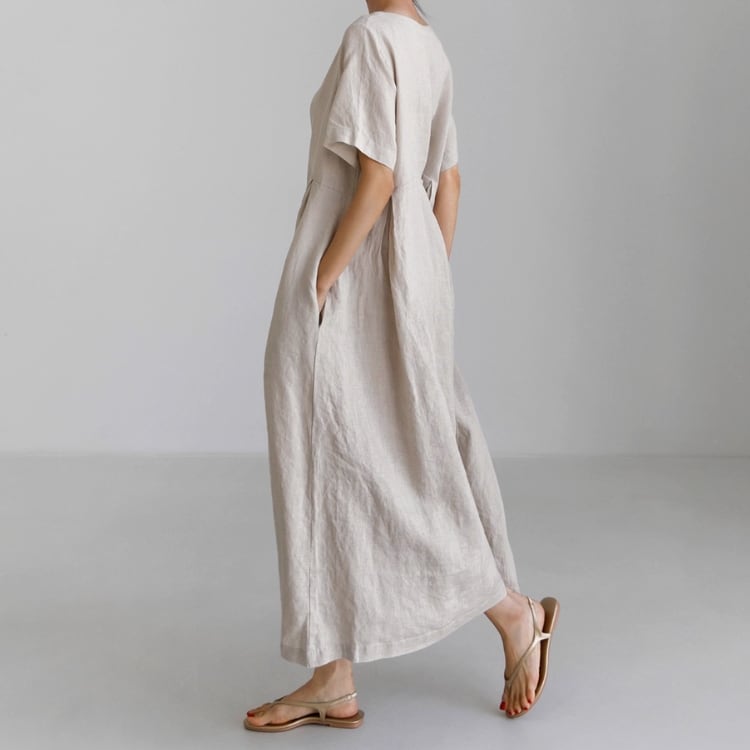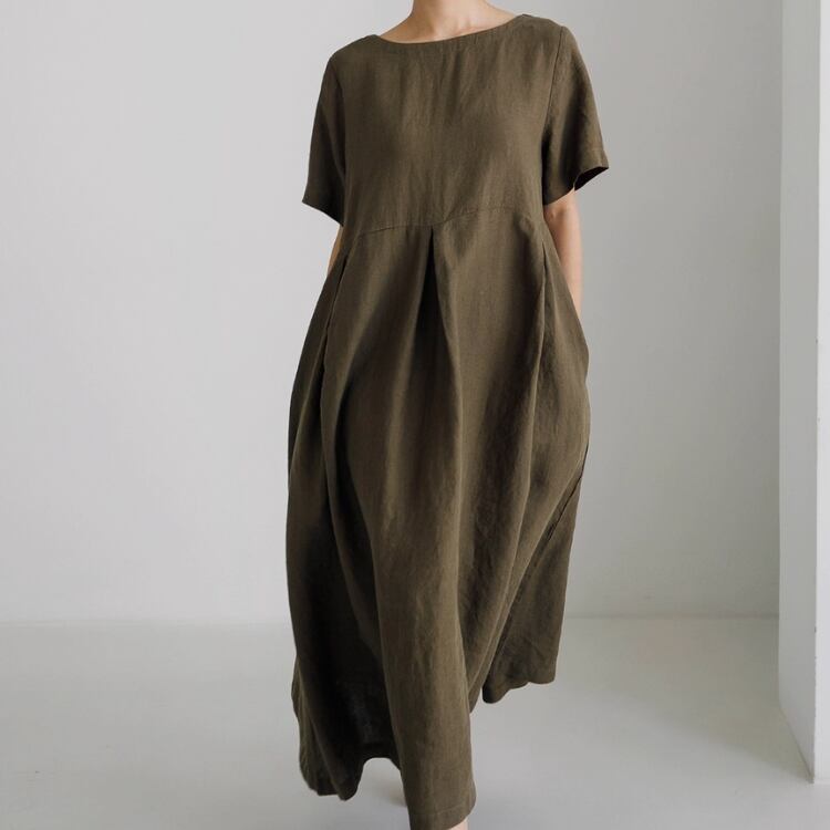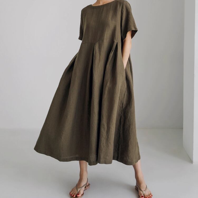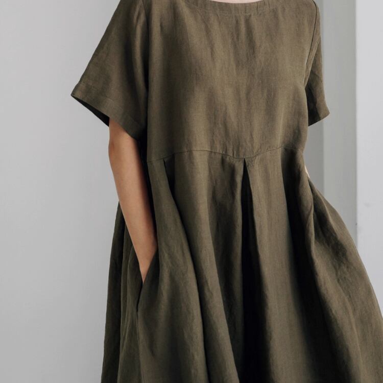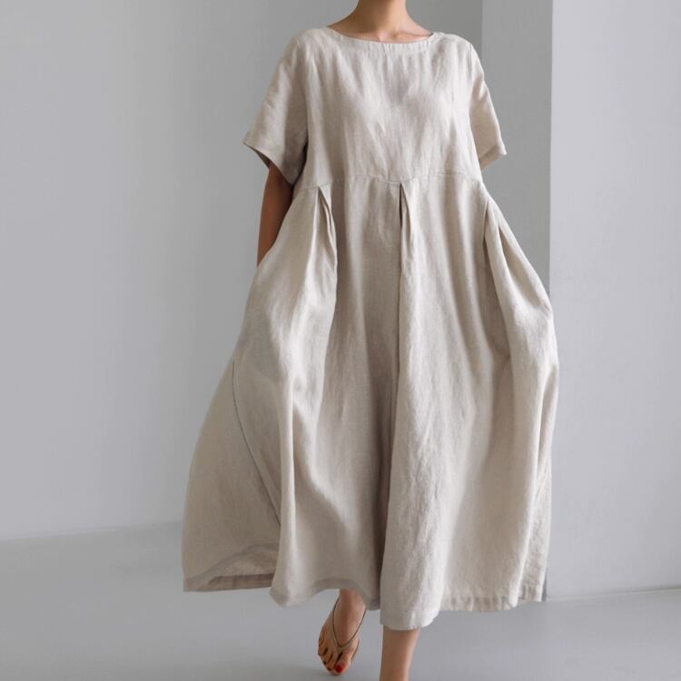 Aラインシルエットが体型をカバーし、ゆったりとした雰囲気を実現。