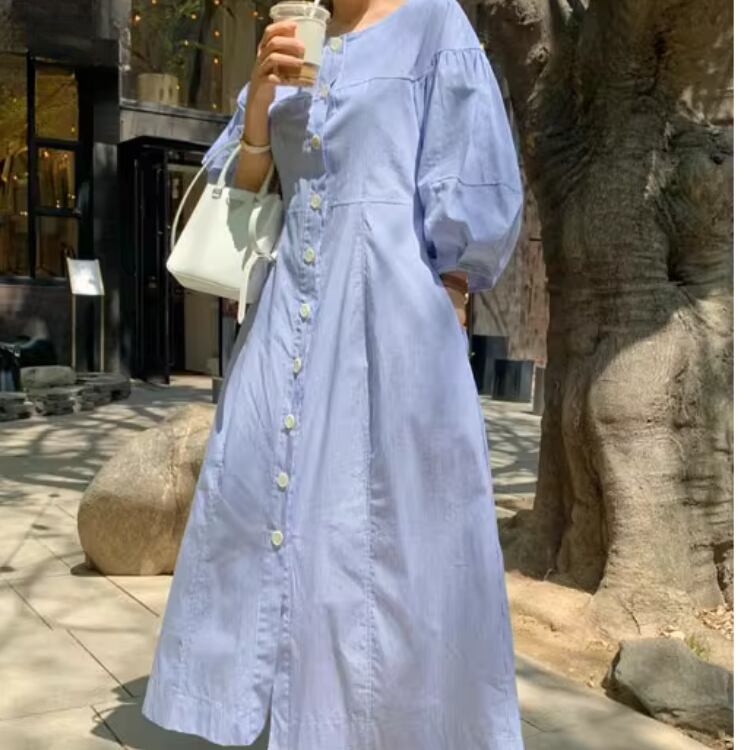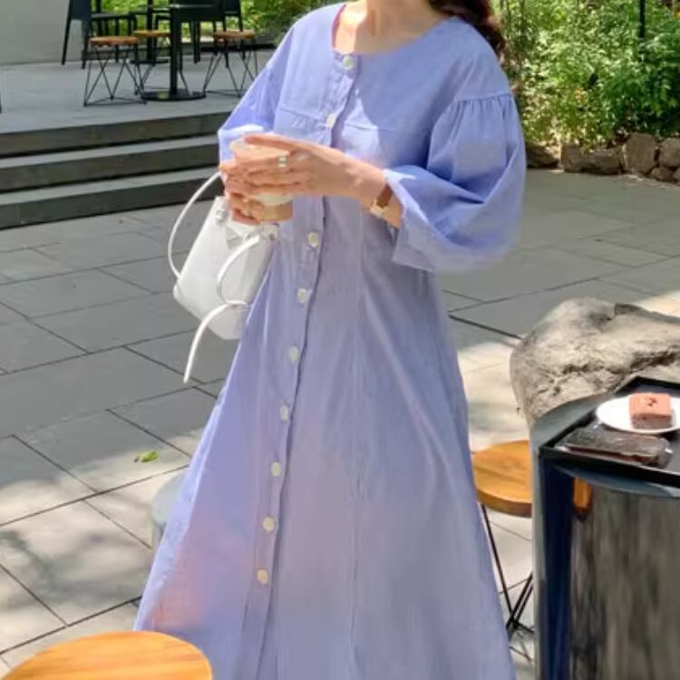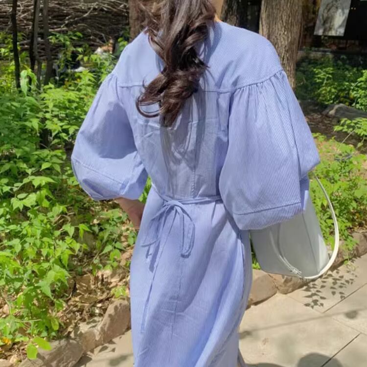 ボタンフロントのデザインが上品で、さりげないストライプ柄が着こなしにこなれ感をプラスします。