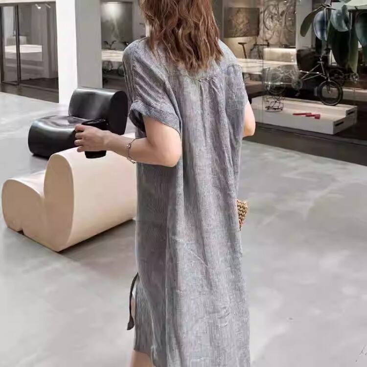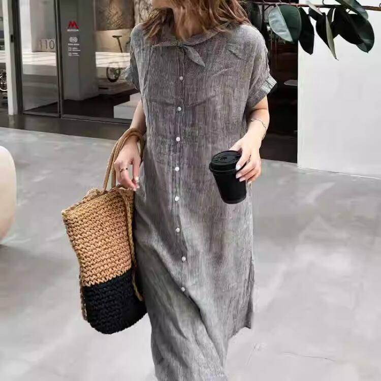 夏から秋口まで活躍する七分袖シャツワンピース。