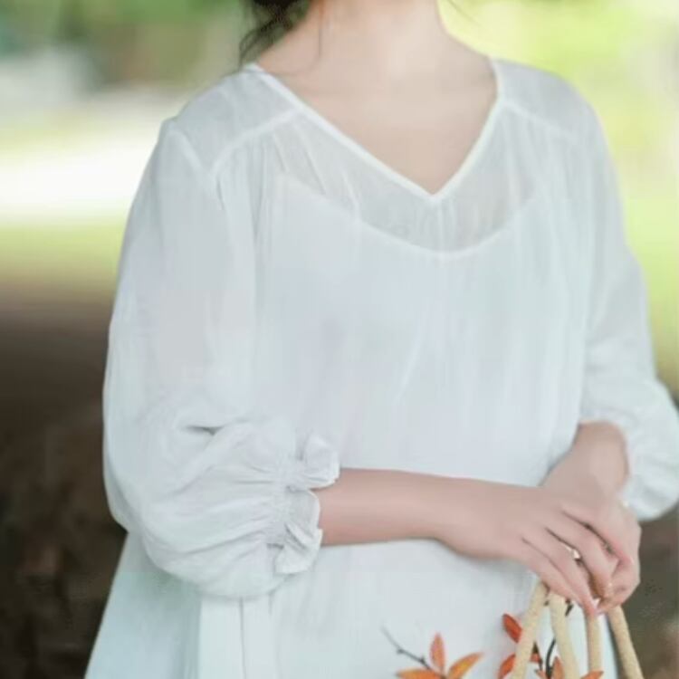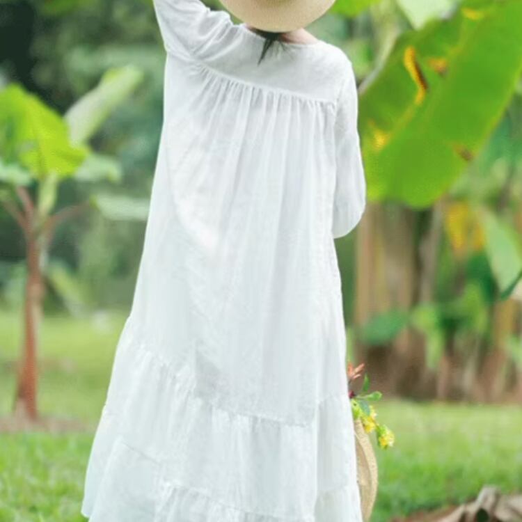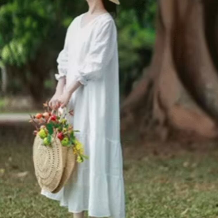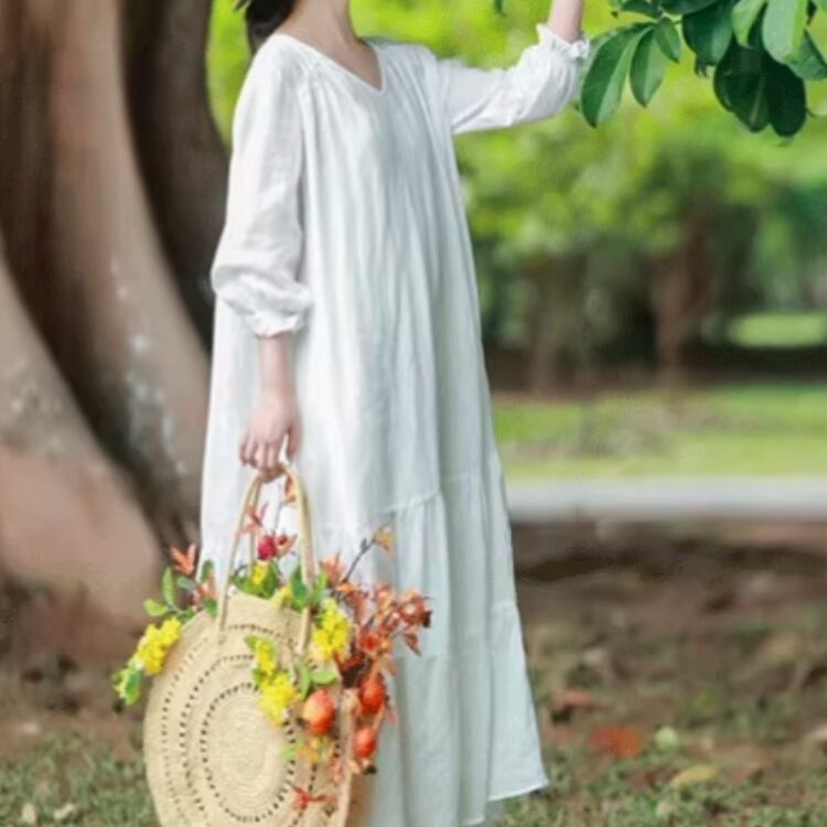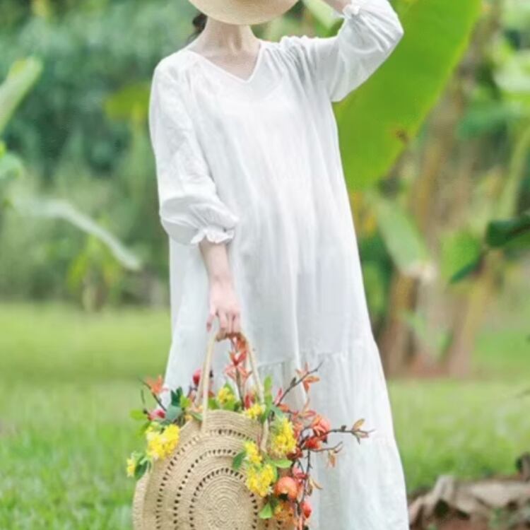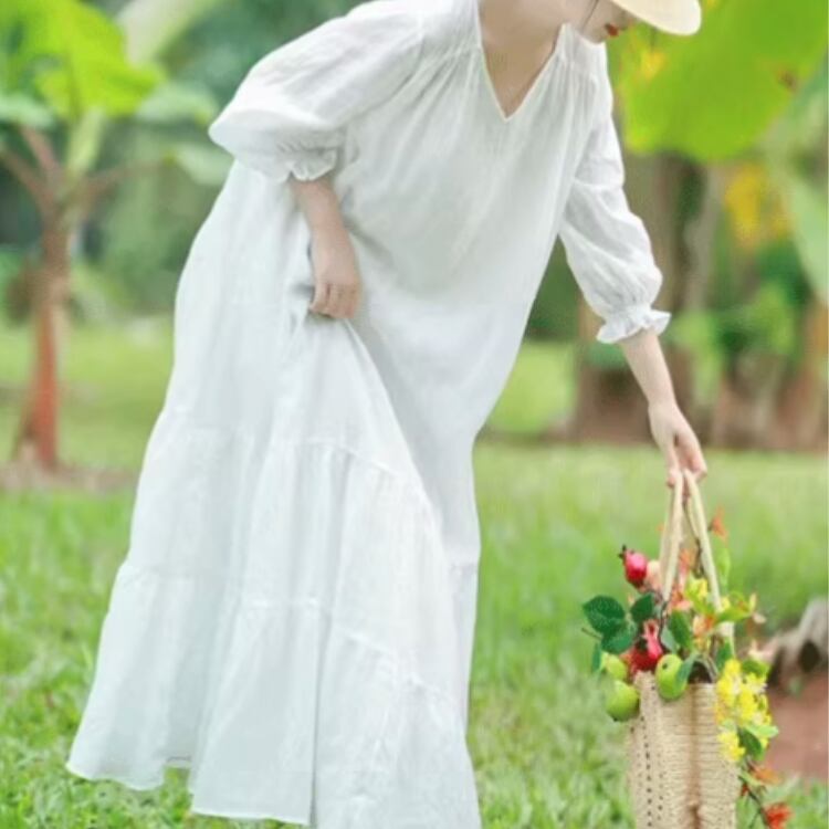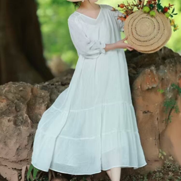Vネックとティアードデザインが女性らしいロングワンピース。