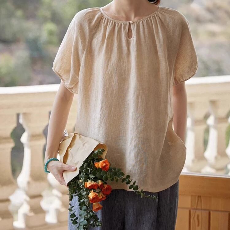 ラウンドネックとフレンチスリーブが醸し出す、さりげない女性らしさ。