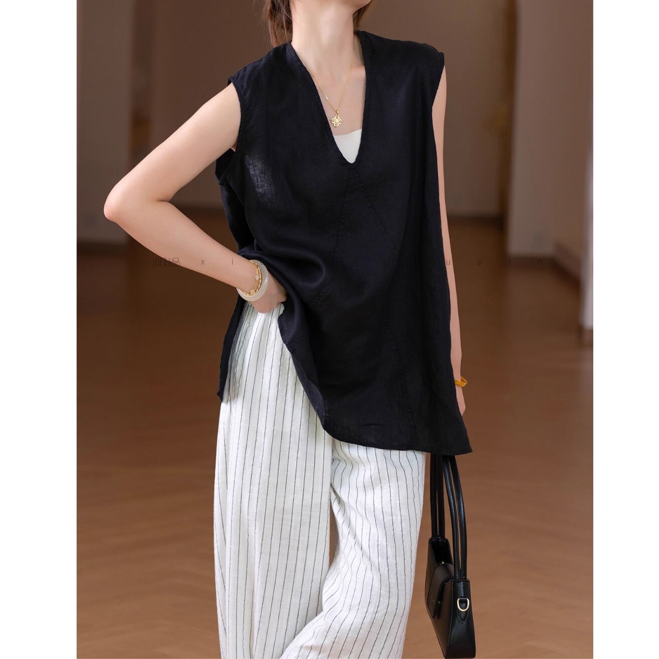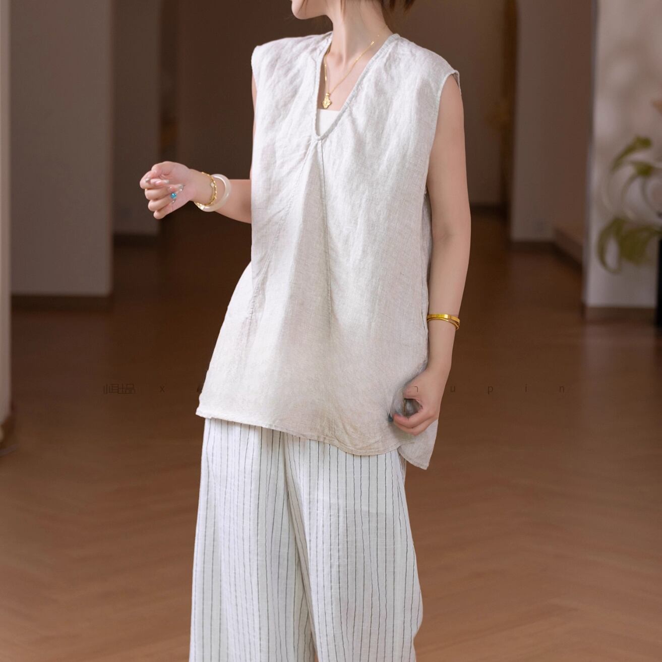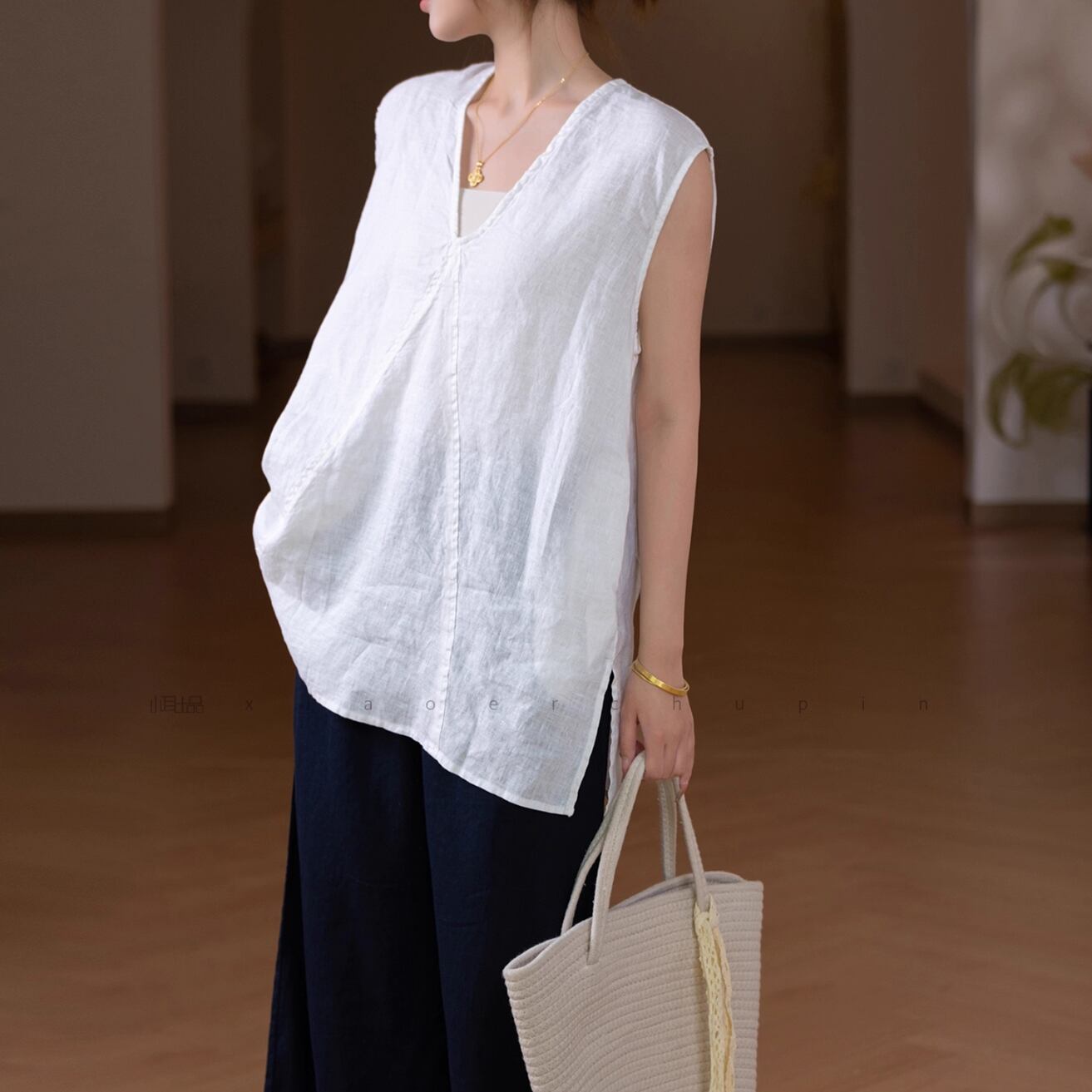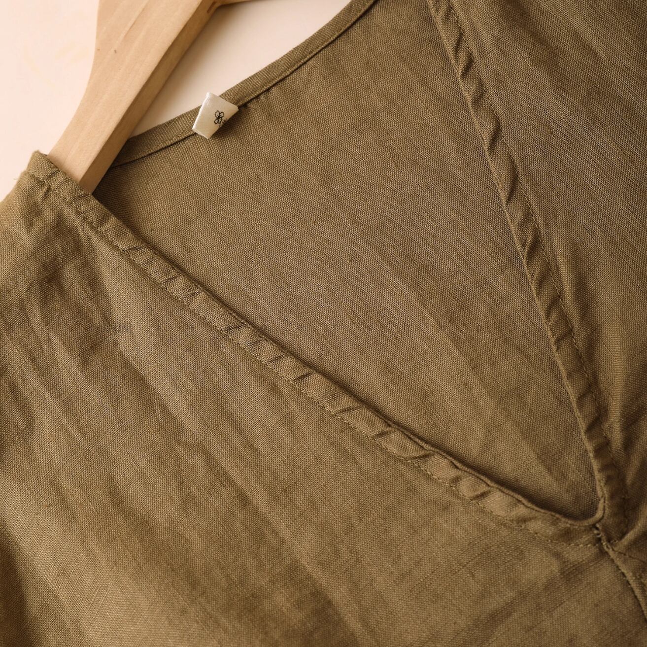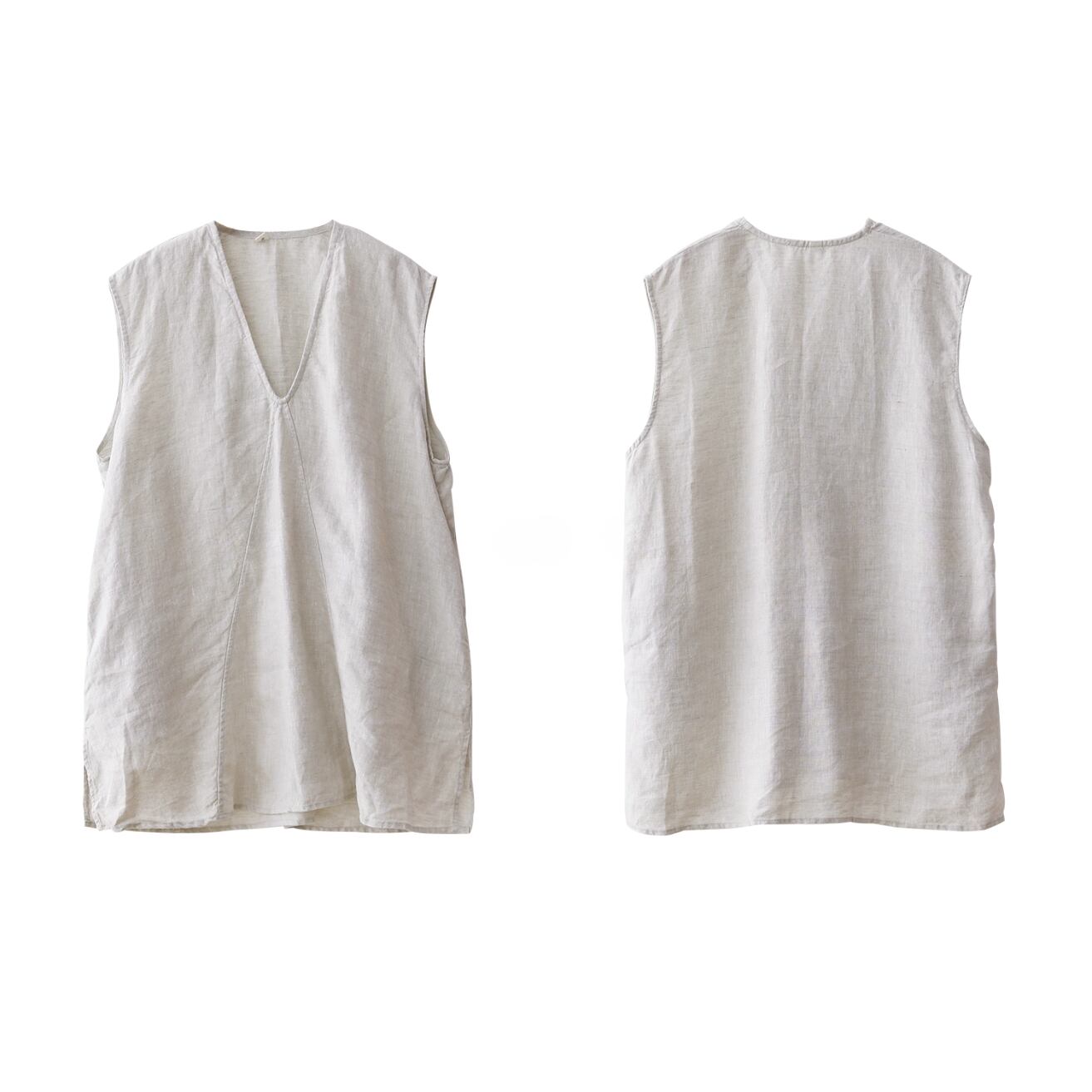 Vネックが首元をすっきりと見せ、ゆったりとしたシルエットがリラックス感を演出します。